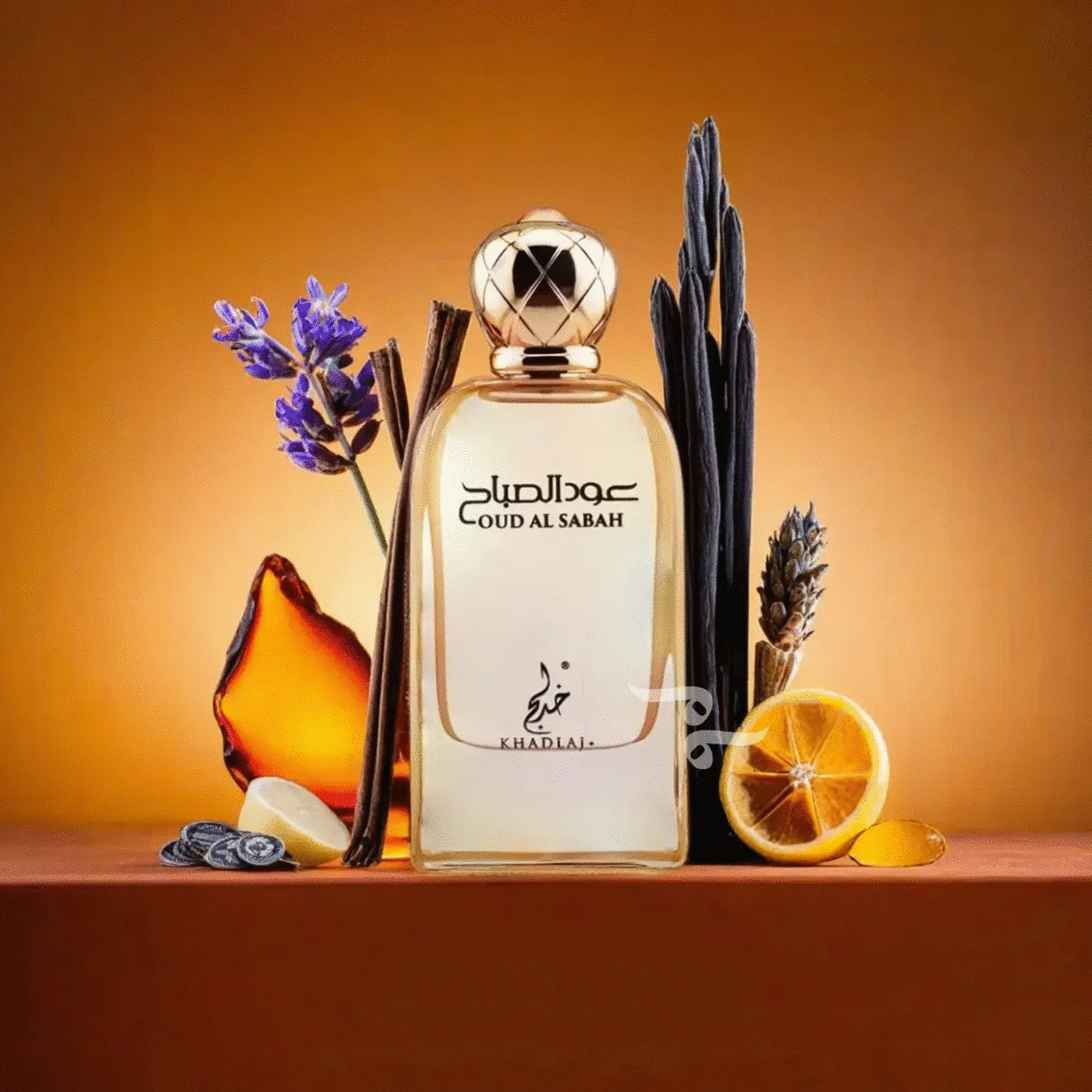 Perfume Khadlaj Oud Al Sabah 100 ml — uma fragrância oriental aromática envolvente com notas de lavanda, resinas, oud, baunilha e âmbar, em um frasco elegante perfeito para ocasiões especiais